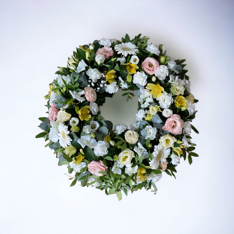 This gentle funeral wreath features a beautiful blend of peach, white, and yellow flowers, creating a soft and soothing tribute. The warm peach blooms symbolise affection and remembrance, while the pure white flowers evoke peace and serenity. The bright yellow flowers add a touch of light and optimism, offering a sense of hope and comfort. Together with lush greenery, this harmonious arrangement serves as a heartfelt and elegant expression of sympathy, honouring a loved one with grace and warmth.
