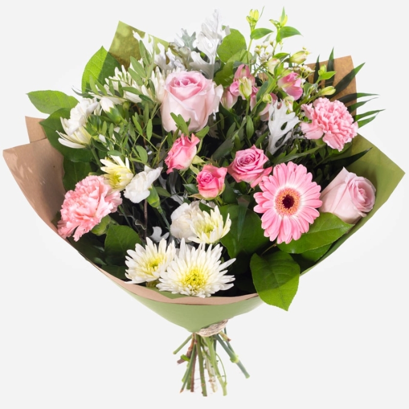 This hand-tied bouquet exudes understated elegance, featuring a soft, harmonious palette of pastel pinks and gentle greens. Carefully selected seasonal blooms are arranged with attention to balance and texture, creating a bouquet that feels both graceful and effortlessly beautiful.