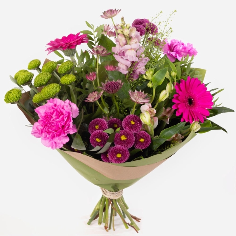 Make a statement with this bright and joyful hand-tied bouquet, featuring an energetic mix of blooms in vivid pink shades. Carefully arranged to highlight colour and texture, this bouquet radiates happiness and charm.